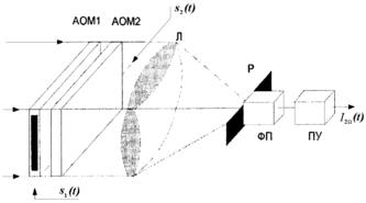 Если в схеме на рис. 4 в качестве опорного транспаранта использовать еще один АОМ, то в результате приходим к схеме процессора, называемой конвольвером (рис.5).