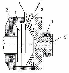 1 – неподвижный диск; 2 – вращающийся диск; 3 – загрузочная воронка; 4 – электронагреватель; 5 – канал для выхода материала.