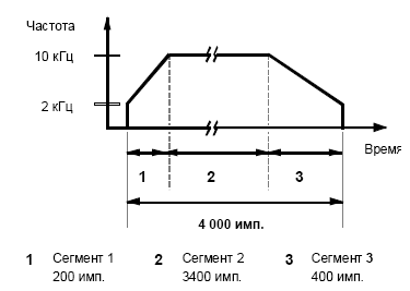 На рисунке 3 показан пример значений таблицы профиля, необходимых для генерирования последовательности выходных импульсов, которая разгоняет шаговый двигатель (сегмент 1), обеспечивает его работу с постоянной скоростью (сегмент 2), а затем тормозит двигатель (сегмент 3).
