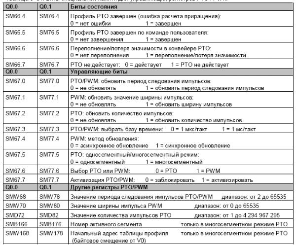 Таблица 2 описывает регистры, используемые для управления функционированием PTO/PWM. Можно использовать таблицу 2 в качестве быстрой справки, чтобы определить значение, которое следует поместить в управляющий регистр PTO/PWM, чтобы вызвать желаемую операцию. Можно изменить характеристики сигнала PTO или PWM, изменяя биты памяти в области SM (включая управляющий байт), а затем исполняя команду PLS.