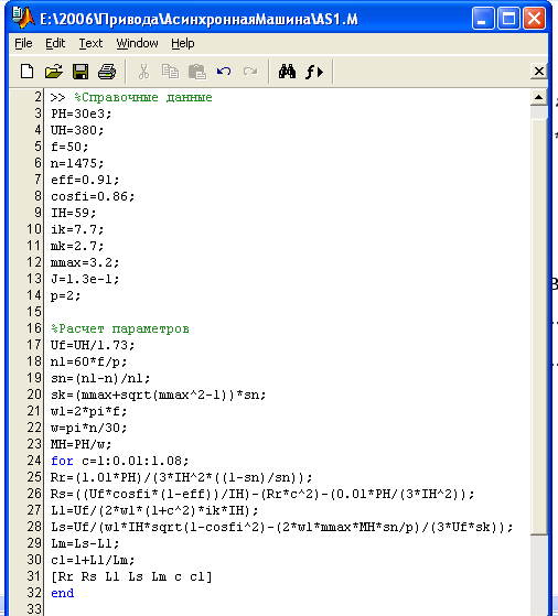 Параметры машины частично берутся из паспортных данных, а частично рассчитываются по уравнениям 2.1…2.12 , либо используя программу (рисунка 2.3, файл as1. m).