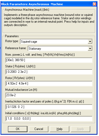 Rr =0,0492 Rs = 0,2083 Lsp = 0,0004 Ls =0,0233 Lm = 0,023