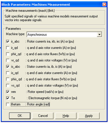 Окно настройки параметров универсального блока измерения переменных машины показано на рисунке 2.4. В выпадающем меню поля Machine type задается тип машины. Флажками выбираются переменные для измерения.