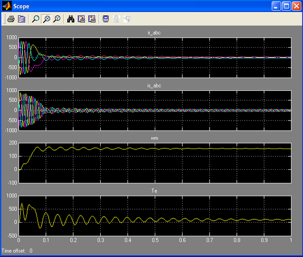 Временные зависимости переменных состояния машины можно наблюдать на экране осциллографа (рисунок 10). Здесь видны и переходный процесс при пуске машины, и установившиеся процессы.