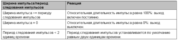 Таблица 4.1. Ширина и период следования импульсов и реакции функции PWM