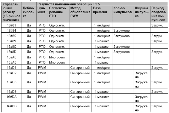 Таблица 2 описывает регистры, используемые для управления функционированием PTO/PWM. Можно использовать таблицу 2 в качестве быстрой справки, чтобы определить значение, которое следует поместить в управляющий регистр PTO/PWM, чтобы вызвать желаемую операцию. Можно изменить характеристики сигнала PTO или PWM, изменяя биты памяти в области SM (включая управляющий байт), а затем исполняя команду PLS.