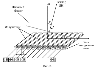 Положение главного лепестка (рис. 3) диаграммы направленности устанавливается по направлению нормали к фазовому фронту электромагнитной волны. Если все элементы решетки возбуждаются синфазно, то фазовый фронт располагается параллельно плоскости решетки, а лепесток ДН нормально этой плоскости. Направление фазового фронта и лепесток ДН отклоняются от начального положения на угол