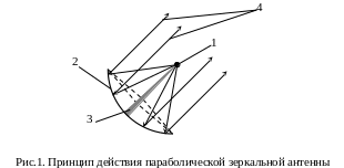 В параболической антенне вся мощность излучения излучается из излучателя 1 (рис.1) на радиоотражающую поверхность 2 (отражатель), отражаясь от отражателя, сигнал 4 излучается в пространство узкой полосой. При этом размеры антенны должны быть сопоставимы с длинной волны рабочей частоты. Такая антенна аналогичным образом работает и на прием.