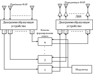 Сигналы, поступающие с направления, соответствующего каналу 1 приемной ФАР, через тракт 1 поступают на вход диаграммообразующего устройства и излучаются через элемент 1 передающей ФАР в направлении подавляемой РЛС. Помехи в зависимости от вида модуляции используются для увода РЛС по скорости, подавления АРУ РЛС с коническим сканированием. Одновременно для маскировки сигналов, отраженных целью, могут излучаться шумовые помехи.