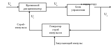 Чтобы исключить прием помех, приемник РЛС отпирается селектирующим импульсом (стробом дальности) только на время прихода полезного сигнала , отраженного целью. При воздействии на вход временного дискриминатора строба дальности и сигнала от цели на его выходе образуется напряжение , пропорциональное времени прихода сигнала от цели, напряжение поступает на вход блока управления, на выходе которого вырабатывается управляющее напряжение , которое поступает на