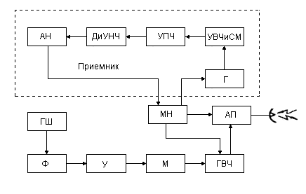 Передатчик состоит из генератора шума (ГШ), фильтра (Ф), усилителя (У), модулятора (М) и генератора высокой частоты
