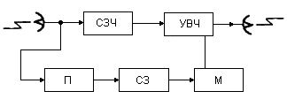 Типичная структурная схема станции имитирующих помех приведена на рис. 14.7. Сигнал подавляемого РЭС, принимаемый разведывательным приемником (П) станции одновременно поступает в схему запоминания частоты (СЗЧ). С выхода приемни-