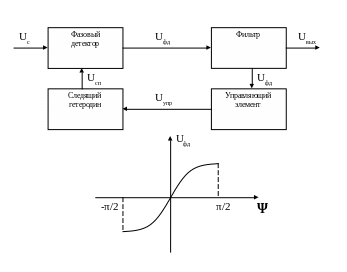 При подаче на вход фазового детектора напряжений сигнала и следящего гетеродина на его выходе образуется напряжение пропорциональное сдвигу фаз ψ между и . Изменение ψ от 0 до приводит к возрастанию по абсолютному значению, а в точке ψ=0 происходит изменение его знака. Фильтр нижних частот сглаживает (подавляет) ВЧ шумы. Под действием управляющий элемент (реактивная лампа, варикап или конденсатор переменной емкости ) изменяет частоту следящего гетеродина до положения =0.