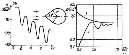 Обозначения приведены на рис. 16.1. На этом же рисунке приведена зависимость ЭПР объекта типа конус-сфера от отношения r/λ рассчитанная с учетом отражения от всех трех областей при облучении вдоль оси тела. Расчеты проведены для конуса с углом при вершине α= 35°.