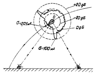 Таким образом, из приведенных результатов видно, что, выбирая различные значения геометрических параметров объектов, можно значительно уменьшить ЭПР радиолокационных объектов. Так, ЭПР головной части межконтинентальной баллистической ракеты, имевшую ЭПР 0,2 м2 оказалось возможным уменьшить на 2-3 порядка только за счет выбора оптимальной формы. На рис.4.3 схематично представлены значения ЭПР головной части ракеты при различных углах наблюдения на среднем участке траектории.