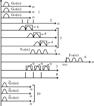 На рис. 8.1 приняты следующие обозначения: 1 - спектры 3-х каналов телефонных сообщений; 2 - поднесущие частоты; 3 - спектры модулированных поднесущих; 4 - фильтры выделения боковых полос; 5 - спектр группового сигнала; 6 - спектр радиосигнала на несущей частоте; 7 - спектр группового сигнала на промежуточной частоте гетеродинного приемника; 8 - сетка поднесущих; 9 - фильтры разделения по каналам; 10 - сообщения в каждом из каналов после фильтрации и детектирования.