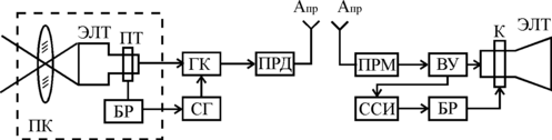 Используемые обозначения: ПК- передающая камера; ПТ- передающая трубка; БР- блок развертки; СГ- синхрогенератор; ТК - телевизионный канал; ССИ- селектор синхроимпульсов (выделяет синхронизирующие импульсы); ВУ- видеоусилитель; К- катушка управления разверткой.