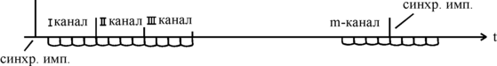 Временное уплотнение получило широкое распространение в последнее время в связи с развитием быстродействующей цифровой элементной базы. Структура сигналов во временной области при временном уплотнении каналов показана на рис. 8.2.