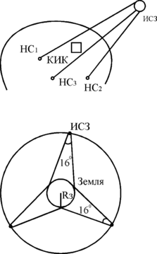 Рис. 8.6 . Схемы зон обслуживания в РТС ПИ на основе одного и трех стационарных ИСЗ