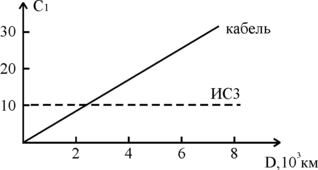 Рис. 8.7. Сопоставление стоимости кабельной системы передачи информации с РТС ПИ на ИСЗ.