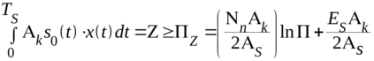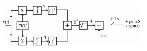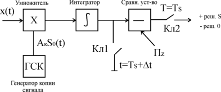 Сигнал перемножается с сигналом генератора копии сигнала (ГКС) (с небольшим отклонением по фазе) и интегрируется. Результат сравнивается с порогом, подаваемым через ключ 2, и знак суммарного напряжения символизирует решение («+» - сигнал есть, «» - сигнала нет). В конце действия сигнала при