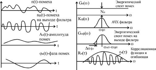 Рис. 4.2. Характер помех на входе и выходе фильтра во временной и спектральной форме.