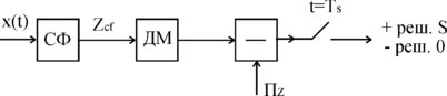 На рис. 5.1 показана структурная схема фильтрации с СФ радиосигнала длительностью Ts. При t=Ts электронный ключ включается и на выходе образуется сигнал оценки решения (+ - сигнал есть, - сигнала нет).