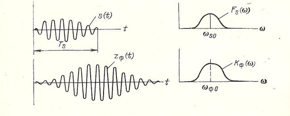 Обычные радиосигналы квазипериодичны, т.е. содержат несколько периодических составляющих. Даже для идеального случая радиосигнала с прямоугольной огибающей, импульсный радиосигнал длительностью содержит несущую частоту о и ряд гармоник, задаваемый преобразованием Фурье для импульсного изменения напряжения. На рис. 5.3 показаны: огибающая импульсного радиосигнала длительностью =Ts после детектирования S(t); комплексная спектральная характеристика согласованного фильтра Ксф(), согласованная со спектром сигнала Fc(j); сигнал на выходе фильтра Zсф(t).