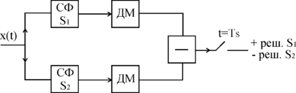 Рис. 5.2. Схема устройства согласованной фильтрации для оптимального распознавания сигналов с частотной манипуляцией (СФ-S1 и СФ-S2 – узкополосные согласованные фильтры с пропусканием на частотах манипуляции f1 и f2)