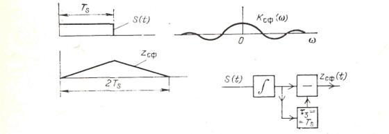 Рис. 5.3. Схема устройства согласованной фильтрации для импульсного сигнала длительностью Ts и его входная, выходная и передаточная характеристики