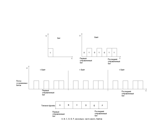 При работе с битами наиболее наглядным представлением является график зависимости напряжения от времени. Однако обычно приходится иметь дело с более крупными порциями данных, а также с адресами и управляющей информацией, в результате чего изображение всей этой информации в виде графика из-за большого ее объема было бы ненаглядным и весьма неудобным. Другим типом представления может быть диаграмма формата фрейма, которая строится на основе зависимостей напряжения от времени. Такую диаграмму можно читать слева направо, как обычное изображение па осциллографе. Диаграмма формата фрейма отображает группы битов (поля); при этом с различными полями связываются определенные функции.