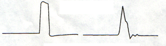 В технологии 10ВАSЕ-Т передача происходит с использованием сигнализации с напряжением +1 и —1 В при двухвольтовом дифференциальном пиковом сигнале NLP-сигнализация использует только диапазон от 0 до +1 В. Длительность одиночного NLP-импульса составляет 100нс. На рис.18 показаны два типа NLP-импульсов. Импульс слева имеет очень острый пик и четкую форму — он получен от интерфейса, способного работать на скорости 1000 Мбит/с. Импульс справа поступил от устройства старой версии, поддерживающего только скорости 10/100 Мбит/с и не требующего особой четкости сигнала.