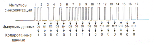Пакет FLP состоит из 33-х импульсов, представляющих 16-битовое кодовое слово, которое перемежается с 17-ю импульсами синхронизации. Импульсы в пакете разделены временными промежутками длительностью 62,5 мс (±7 мс). Между всеми импульсами синхронизации находятся позиции для импульсов данных. Если позиция импульса данных присутствует, она интерпретируется как бинарная единица. Отсутствие импульса данных в промежутке между двумя импульсами синхронизации интерпретируется как бинарный ноль. Как показано на рис.20, 17 импульсов синхронизации присутствуют всегда. 16 импульсов данных присутствуют только в том случае, если они представляют бинарную единицу, и отсутствуют, если представляют бинарный ноль ц кодированном 16-битовом слове данных. Импульсы, интерпретированные как бинарные единицы данных, затенены.