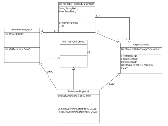 Объект WKO Singlecall должен быть выполнять роль контроллера транзакции и быть доступен для клиентских вызовов по протоколу HTTP. Объект при вызове операции Commit() должен создавать Proxy объекты Singleton и CAO объектов и выполнять копирование изменных объектов из CAO в WKO Singleton по каналу IPC. При копировании должна выполняться проверка целостности данных, т. е. должно проверяться наличие и соответствие данных в WKO Singleton объекте, первоначальным данным в CAO объекте. В случае неудачи результат выполнения операции — строка ошибки(по желанию можно реализовать передачу сериализованного объекта Exception). Операция Rollback — очищает CAO объект.