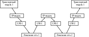 Функционирование механизмов протокола происходит следующим образом. В начальный момент передачи протокол транспортного уровня выдает IP-модулю свой блок данных и необходимые параметры для передачи. IP-сервис строит заголовок дейтаграммы, присоединяет к нему полученные данные, определяет следующий шлюз по маршруту движения пакета или оконечный хост и передает пакет в интерфейс “своей” локальной сети (LNI). Здесь пакет инкапсулируется в соответствующий локальный “конверт”. На промежуточном маршрутизаторе пакет “разворачивается”, обрабатывается его заголовок, определяется маршрут его дальнейшего движения, а затем осуществляется передача пакета в интерфейс следующей локальной сети. Аналогичные процедуры происходят на всех маршрутизаторах до достижения пакетом пункта назначения, на котором “развернутый” пакет передается транспортному модулю. Схема движения IP-дейтаграммы показана на рис.1.