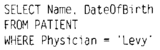 Этот оператор извлекает из отношения PATIENT все строки, в которых атрибут Physician имеет значение 'Levy'. Значения атрибутов Name и DateOf Birth из этих строк он затем помещает во вторую таблицу.