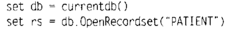 В некоторых случаях вместо вызовов функций используется объектно-ориентированный синтаксис. В приведенном ниже коде Access объектный указатель db устанавливается на открытую в данный момент базу данных, а объектный указатель rs ссылается на строки таблицы PATIENT;