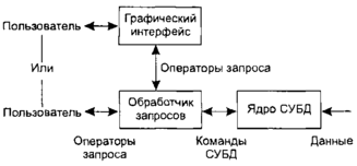Второй тип интерфейса к базе данных — это язык запросов и обновлений (query/ update language), или просто язык запросов (query language). (Хотя большинство такого рода языков позволяют выполнять как запрос, так и обновление данных, их чаще всего называют языками запросов.) В этом случае пользователь вводит команды, которые указывают, какие действия необходимо произвести над базой данных. СУБД расшифровывает эти команды и выполняет предписанные действия. Рисунок 8.6 показывает, какие программы участвуют в обработке запроса.