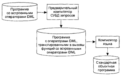 Прикладная программа со встроенными командами передается на предварительный компилятор, входящий в комплект СУБД. Он транслирует операторы доступа к данным в корректные вызовы функций и определяет области данных, которые будут совместно использоваться прикладными программами и СУБД. Предварительный компилятор также вставляет в программу код, поддерживающий доступ к этим областям данных. Обработанная таким образом программа передается на языковой компилятор. На рис. 8.7 показано взаимодействие программ в этом процессе.