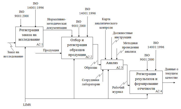 Реализация процессов на предприятии происходит посредством участия менеджера по качеству, КСО, сотрудников лаборатории и технологии LIMS. Результатом работы данной модели являются предписания другим отделам предприятия; Удостоверение качества; Сертификат соответствия стандартам качества.