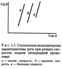 дуги опускается ниже, качественно сохранив при этом свою форму. Кривую статической характеристики можно разделить на три области: падающую, жесткую и возрастающую. В первой области увеличение тока приводит к резкому падению напряжения дуги. Это обусловлено тем, что с увеличением силы тока увеличиваются площадь сечения столба дуги и его электропроводность. Горение дуги на режимах в этой области различается малой устойчивостью. Во второй области увеличение силы тока не связано с изменением напряжения дуги. Это объясняется тем, что площадь сечения столба дуги и активных пятен изменяется пропорционально силе тока, в связи с чем плотность тока и падение напряжения в дуге сохраняются постоянными. Сварки дугой с жесткой статической характеристикой находит широкое применение в сварочной технологии, особенно при ручной сварке. В третьей области с увеличением силы тока напряжение возрастает. Это связано с тем, что диаметр катодного пятна становится равным диаметру электрода и увеличиваться далее не может, при этом в дуге возрастает плотность тока и падает напряжение. Дуга с возрас- тающей статической характеристикой широко используется при автоматической и механизированной сварке под флюсом и в защитных газах с применением тонкой сварочной проволоки. При механизированной сварке плавящимся электродом иногда применяют статическую вольтамперную характеристику дуги, снятую не при постоянной ее длине, а при постоянной скорости подачи электродной проволоки (Рис. 3.3). Как видно из рисунка, каждой скорости подачи электродной проволоки соответствует узкий диапазон токов с устойчивым горением дуги. Слишком малый сварочный ток может привести к короткому замыканию электрода с изделием, а слишком большой — к резкому возрастанию напря- жения и ее обрыву.