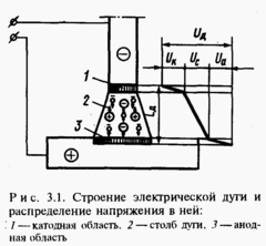 По длине дугового промежутка дуга разделяется на три области (рис. 3.1): катодную, анодную и находящийся между ними столб дуги. Катодная область включает в себя нагретую поверхность катода, называемую катодным пятном, и часть дугового промежутка, примыкающую к ней.