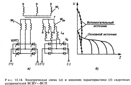 Принципиальная электрическая схема источников типа ВСВУ приведена на рис. 10.14, а. Трехфазный силовой трансформатор имеет одну первичную обмотку W1; и две вторичные W2; и W2 в. Обмотка W2 подключена к тиристорному выпрямителю V(RТ), выполняющему роль регулятора тока и имеющему пологопадающую вольтамперную характеристику. От вторичной обмотки W2 в напряжение подводится к диодному выпрямительному блоку Vв, образующему вспомогательный источник питания дуги с крутопадающей вольтамперной характеристикой с помощью дросселей Lв. Вспомогательный источник питания предназначен для зажигания дуги, сварки на малых токах и др. В процессе сварки дуга питается одновременно от обоих источников. Совмещение двух источников питания позволило существенно снизить напряжение холостого хода основного источника и сформировать крутопадающие внешние характеристики в области рабочих токов (рис.10.14, 6). Источники питания используют для автоматической сварки вольфрамовым электродом.
