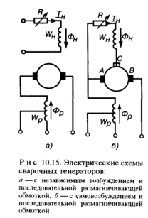 Наибольшее распространение получили сварочные генераторы с падающими внешними характеристиками, работающие по схемам (рис. 10.15):