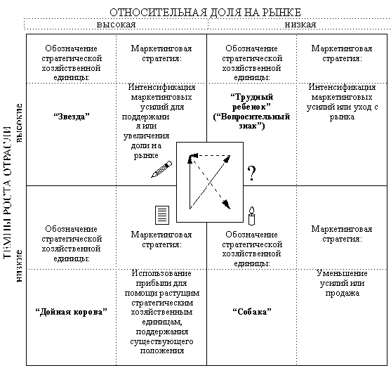 Данная матрица, предложена Бостонской консультативной группой (БКГ) и служит для сопоставления различных стратегических хозяйственных единиц (СХЕ) предприятия. Этот подход позволяет предприятию классифицировать каждую СХЕ по её доле на рынке относительно основных конкурентов. В основе этого подхода лежит обоснованное предположение, что чем больше доля СХЕ на рынке, тем ниже относительные издержки и выше прибыль.