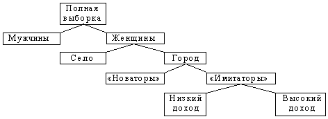 На рис. представлена схема последовательных разбивок по методу AID (автоматического детектора взаимодействия), который получил широкое распространение в процедурах сегментации. Подобные методы перебора вариантов достаточно часто используются при сегментации рынка.