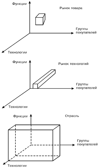 Используя данный подход, можно провести разграничение между тремя различными структурами: рынком одной технологии (отраслью), рынком одной функции (технологическим рынком) и товарным рынком.