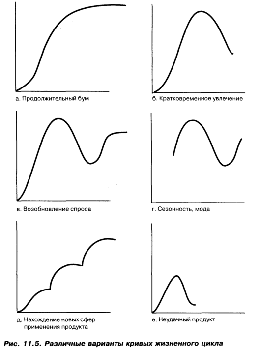 Однако, несмотря на популярность теории жизненного цикла продукта, нет свидетельств, подтверждающих, что большинство продуктов проходят типичный четырехфазовый цикл и имеют стандартные кривые жизненного цикла. Нет также свидетельств того, что поворотные моменты различных фаз жизненного цикла в той или иной степени предсказуемы. Кроме того, в зависимости от того, на каком уровне агрегирования рассматривается продукт, можно рассматривать различные типы кривых жизненного цикла.