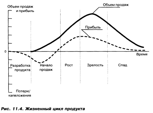Жизненный цикл описывается изменением показателей объема продаж и прибыли во времени и состоит из следующих стадий: начала продаж (внедрения на рынок), роста, зрелости (насыщения) и спада.