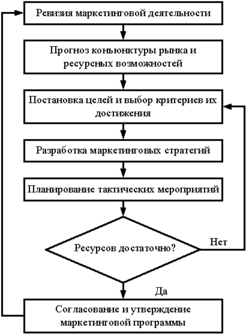 Проводить успешную стратегическую политику, обеспечивающую стабильное развитие предприятия и сведение к минимуму рисков возникновения кризисных ситуаций, позволяют специальные программы маркетинговой деятельности. Маркетинговая программа представляет собой разработанный на основе комплексных исследований рынка и собственных ресурсных возможностей план научно-технической и производственно-сбытовой деятельности предприятия на планируемый период времени, определяющий оптимальный вариант его развития. Процесс разработки маркетинговой программы не является тривиальной задачей, поэтому при его реализации необходимо применять методы системного анализа и, в частности метод структуризации (декомпозиции). На рис. 7. изображен укрупненный алгоритм работ по составлению маркетинговой программы.